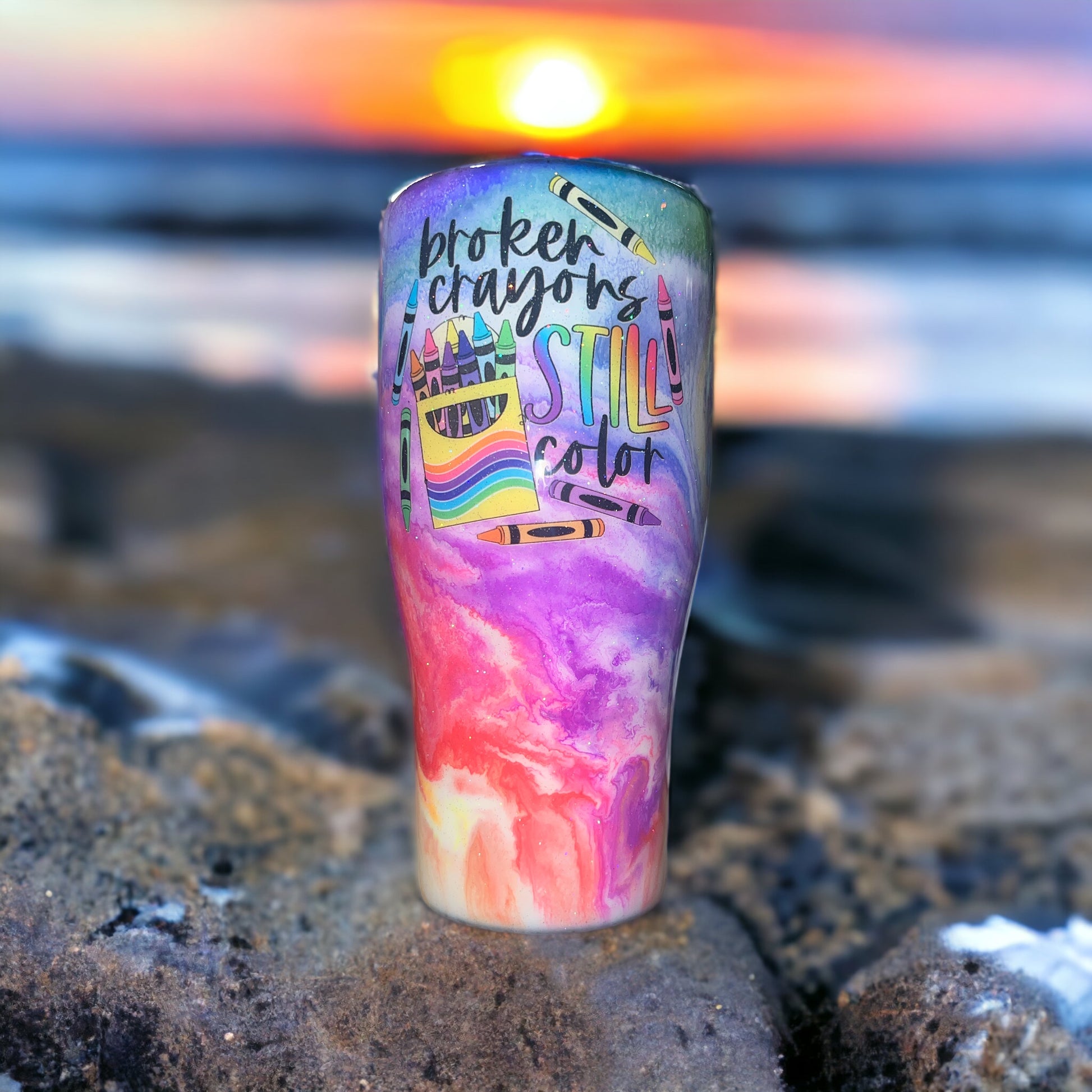 Unleash your inner artist! Strut around with this 24oz neon modern curve and "broken crayons still color" design. Be the envy of your peers and make a statement with this luxury drinking cup. Make a splash with this one-of-a-kind, eye-catching design!