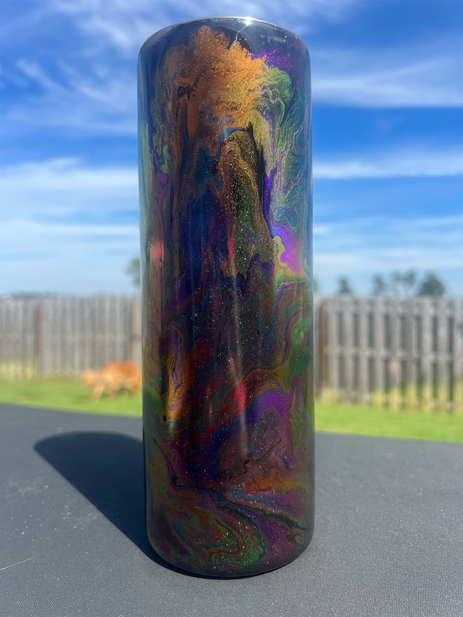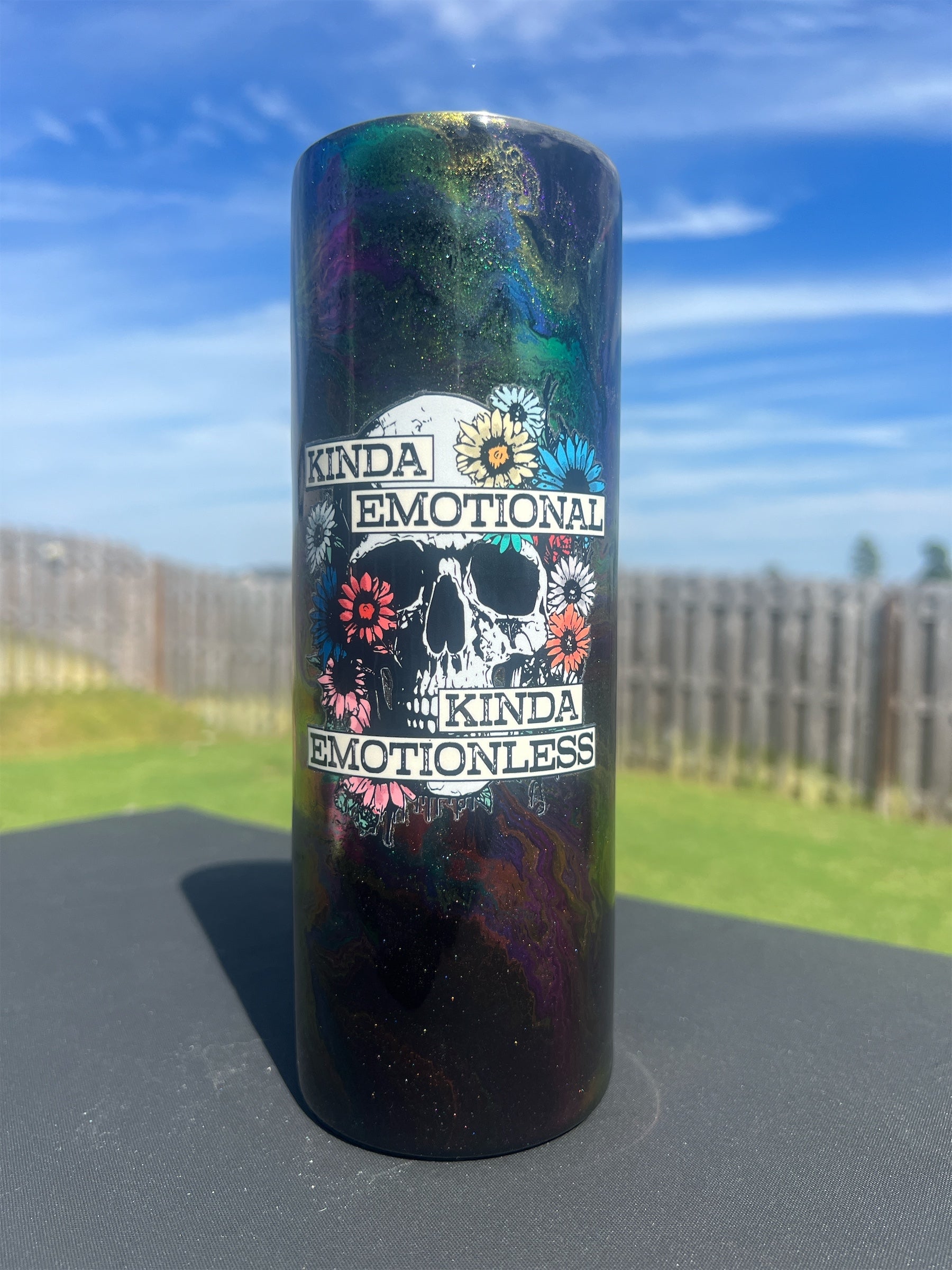 This 20oz drinking cup features an exclusive “oil slick” look that infuses a smooth, reflective design with bold, vibrant hues. The exterior is detailed with an Emotional/Emotionless decal for a perfect balance of style and function. Make a statement with this one-of-a-kind tumbler!